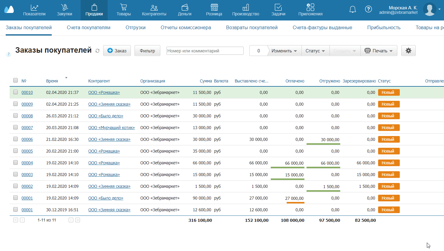 1. Перейдите в раздел Продажи → Заказы покупателей.