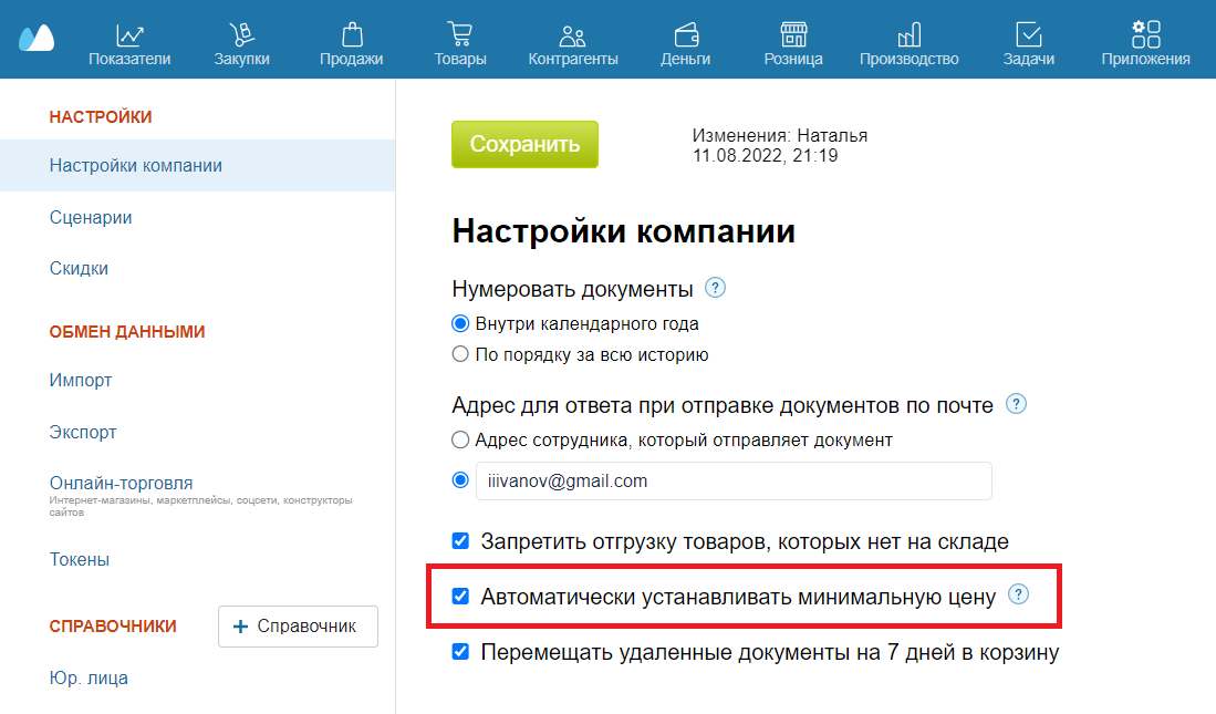 Минимальная цена предотвращает продажу в убыток из-за слишком большой скидки или ошибки продавца. Если в документе продажи указана цена ниже минимальной, она окрашивается в красный. Чтобы в случае ошибки цены автоматически поднимались до минимальных.