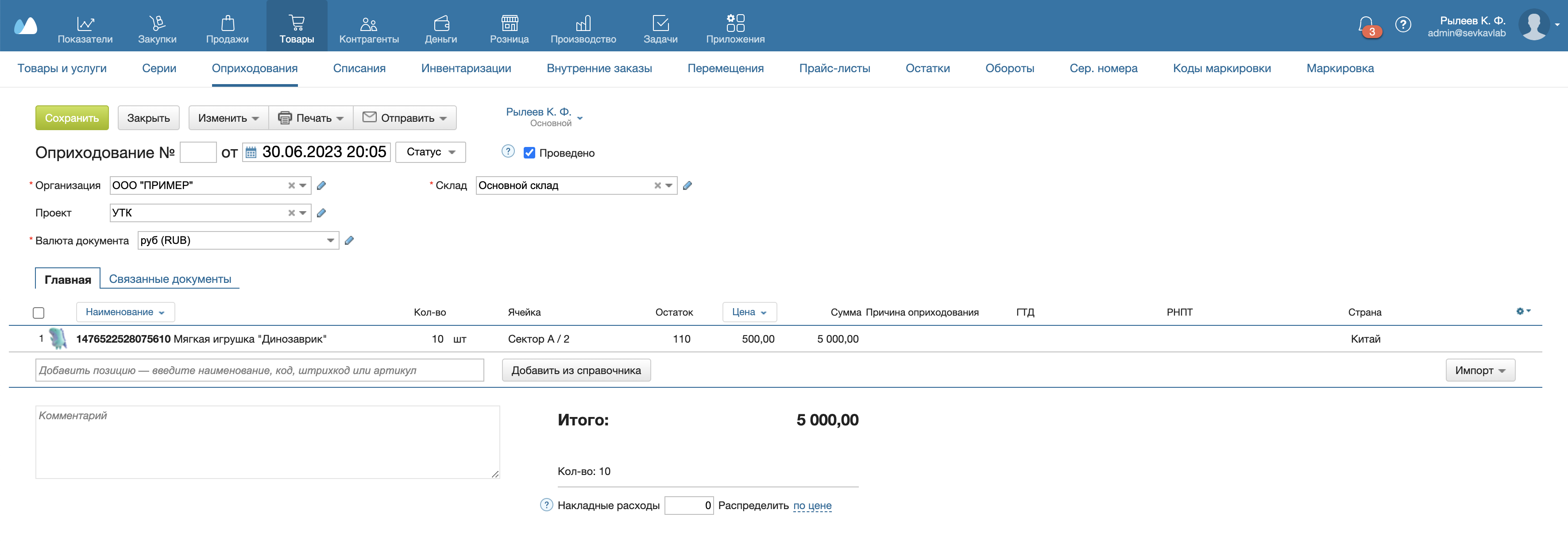 Оприходование позволяет учесть на складе излишки товаров, обнаруженные при инвентаризации. Также оприходование позволяет учитывать пересортицу и вносить на склад начальные остатки. Для каждого склада создается отдельный документ оприходования.