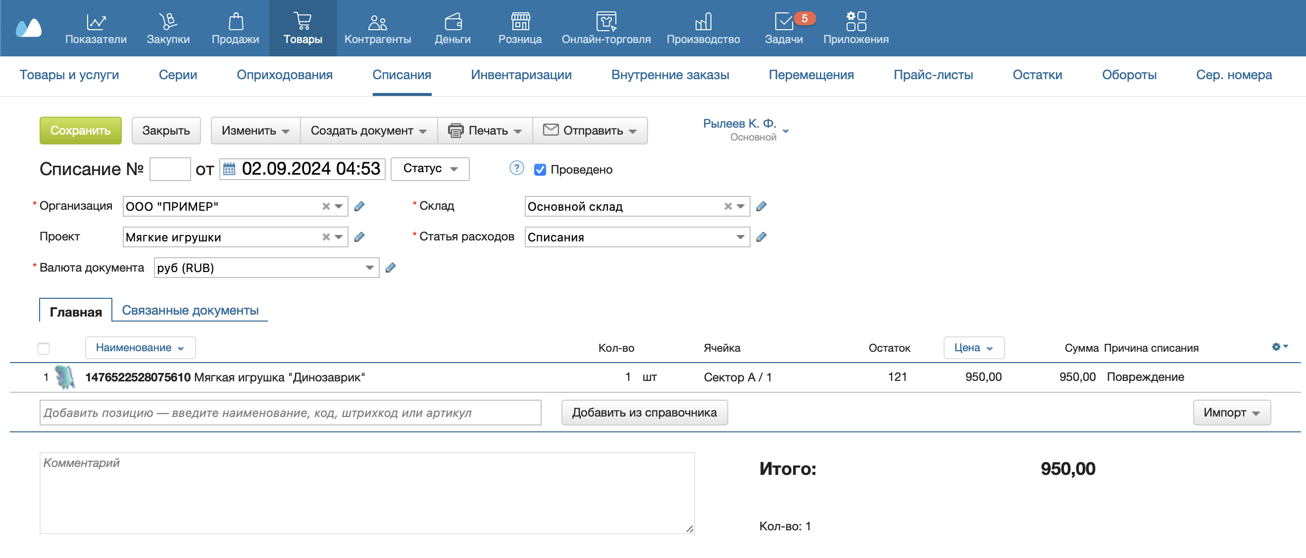 Списание проводится в результате инвентаризации. При списании со склада списываются недостающие или испорченные товары. Для каждого склада создается отдельный документ списания.
