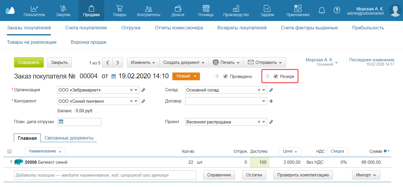 Резерв действует на все товары в документе. Чтобы отменить резервирование товара, снимите флажок в заказе покупателя.