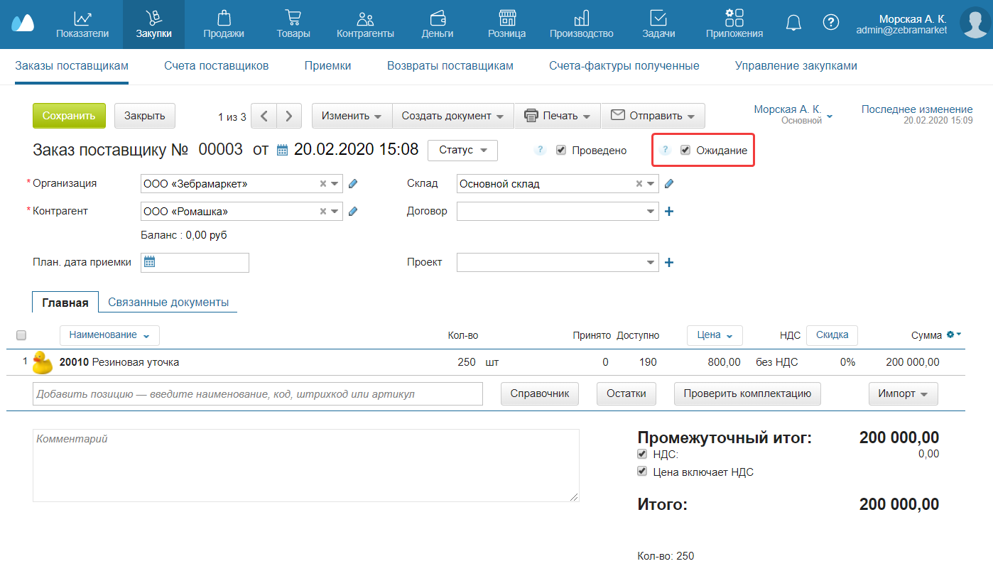 - Откройте нужный Заказ поставщику.