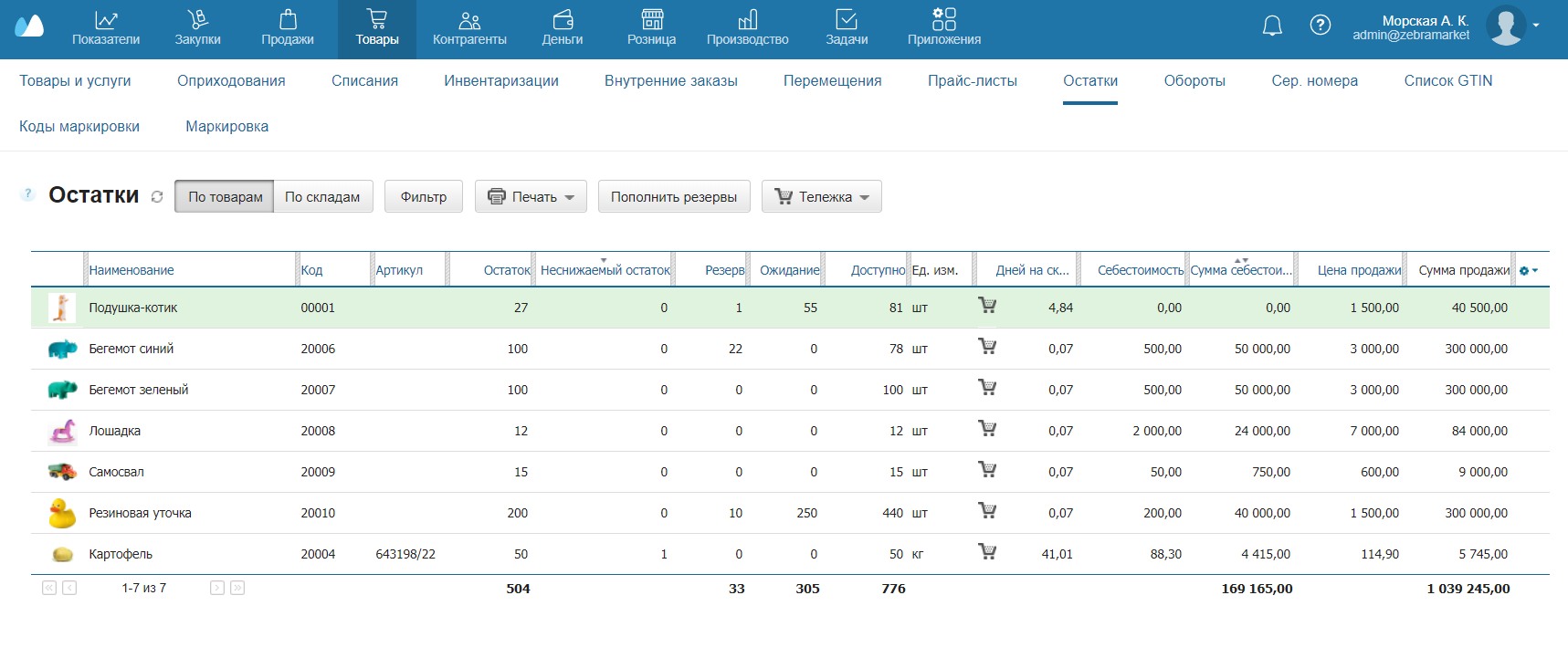 Все эти показатели доступны в разделе Расчет остатков → Остатки. По нажатию на строку товара открывается детализация по документам, на основе которых показатели сформированы.