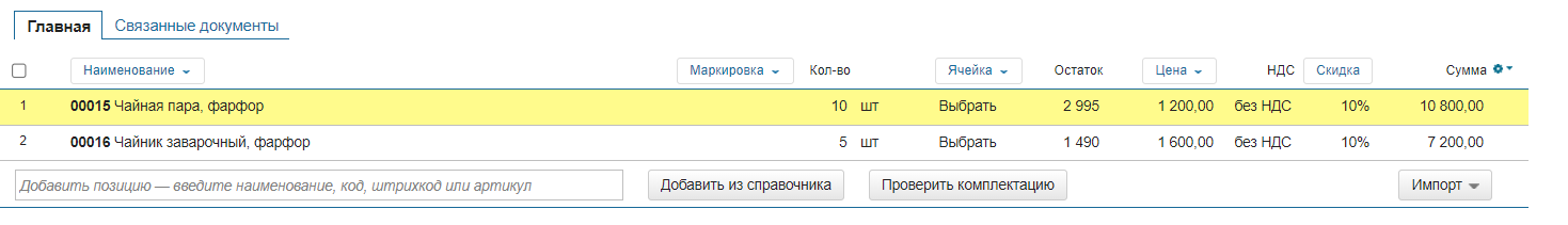 - Склад — склад, с которого производится отгрузка;