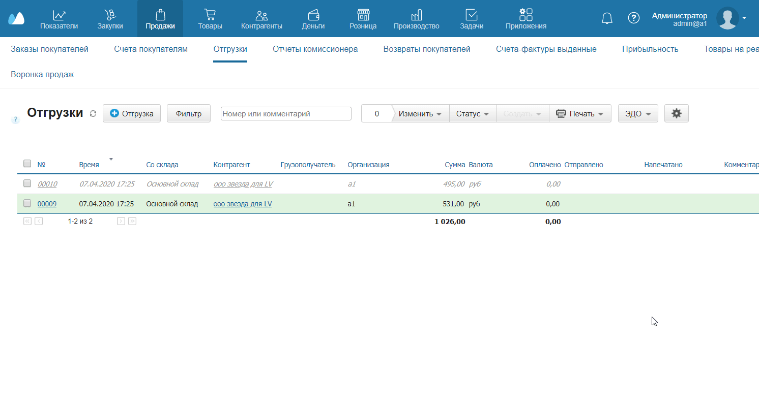 - Перейдите в раздел Продажи → Отгрузки.