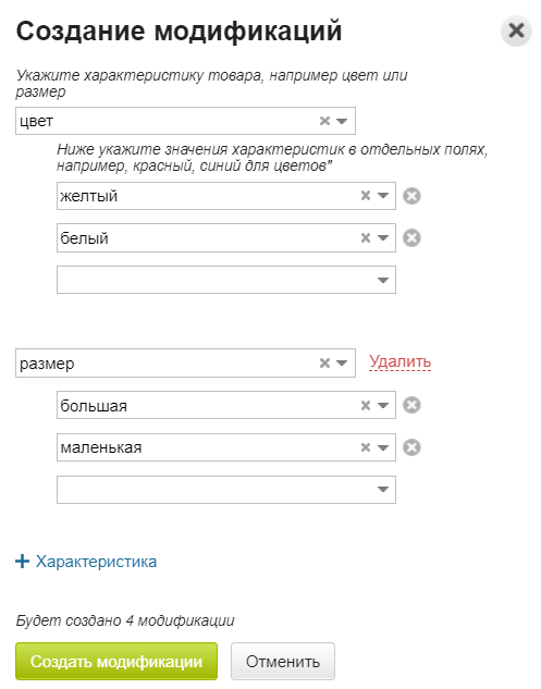 Модификации — это варианты товара, которые различаются по какой-либо характеристике. Например, по размеру или цвету.
